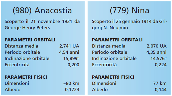 Tabella Asteroidi  Ottobre Il primo, Anacostia è un asteroide di circa 80 km di diametro; una tranquilla fascia principale, ma con un’orbita decisamente eccentrica e inclinata, che ogni 9 anni lo porta ad avvicinarsi alla Terra fino a 1,245 UA e a brillare di una apprezzabile mag. +10,8. Niente male per un pianetino capace di allontanarsi fino a 4,25 UA, perdendosi in magnitudini che superano la +14!