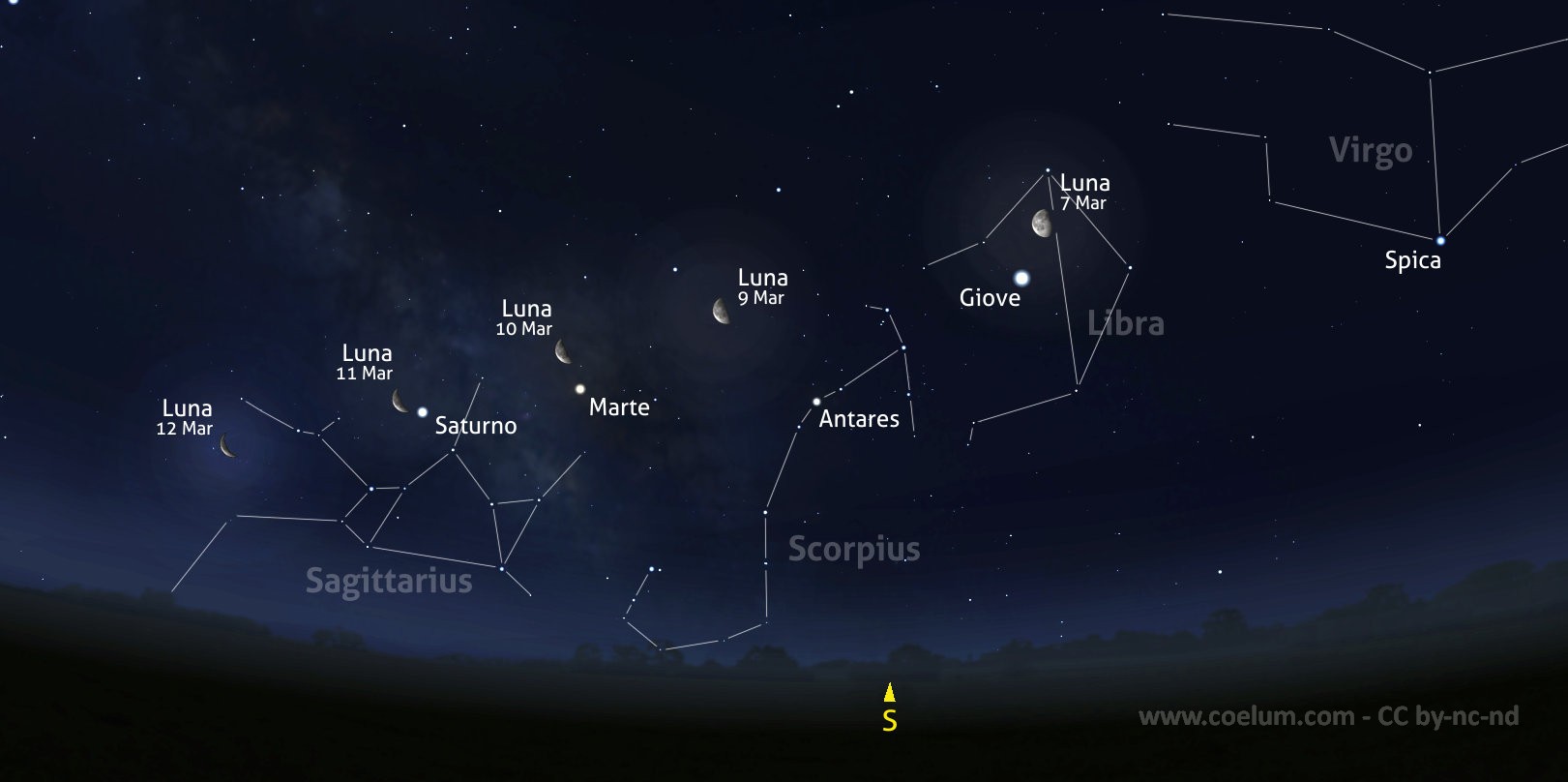 Il 10 marzo, sempre al mattino dalle 5:00 per avere anche Giove e Saturno a vista, potremo ammirare la Luna (fase del 43%) avvicinare il pianeta Marte (mag. +0,7) a circa 3° e mezzo di distanza. Il luogo dell’incontro sarà la regione di confine tra le costellazioni dell’Ofiuco e del Sagittario. All’ora indicata i due astri saranno alti circa 22° sull’orizzonte sud-sudest.