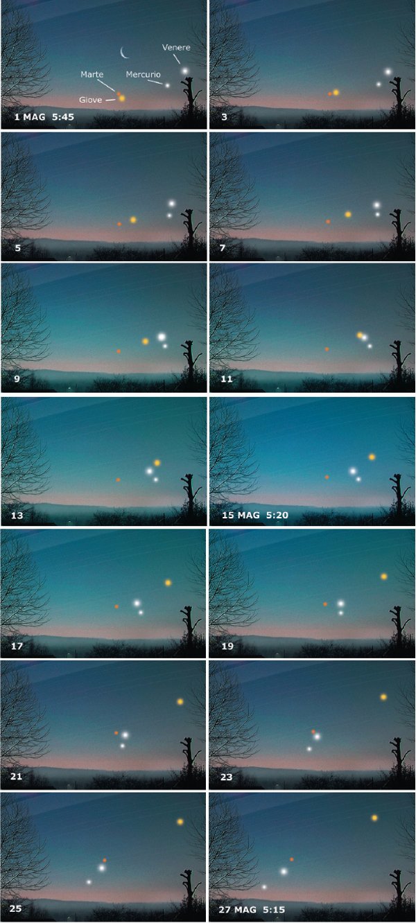 Per tutto il mese di maggio quattro pianeti (Mercurio, Venere, Marte e Giove) daranno spettacolo sopra l’orizzonte est-nordest poco prima del sorgere del Sole. Il 1° maggio Marte si troverà (in un sistema di riferimento altazimutale) 22′ a nordest di Giove; l’11 Venere transiterà 45′ a sudest di Giove, con Mercurio 1,5° più in basso; il 22 Mercurio, Venere e Marte si troveranno raggruppati in un raggio di 1,2°.
