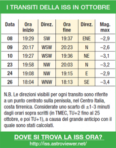 Il primo appuntamento è per l’8 ottobre, dalle 19:29 alle 19:37, osservando da SW ad ENE. La ISS sarà ben visibile, in particolar modo dal centro e sud Italia, che saranno favoriti per la sua osservazione. La magnitudine massima si attesterà su un valore di –2,9.