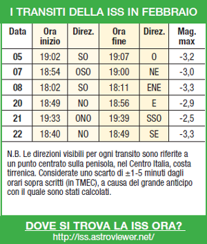 Si inizia il 5 febbraio, osservando da SO a E dalle 19:02 alle 19:07, la ISS sarà ben visibile da ogni zona del paese, con preferenza però per il Sud Italia.