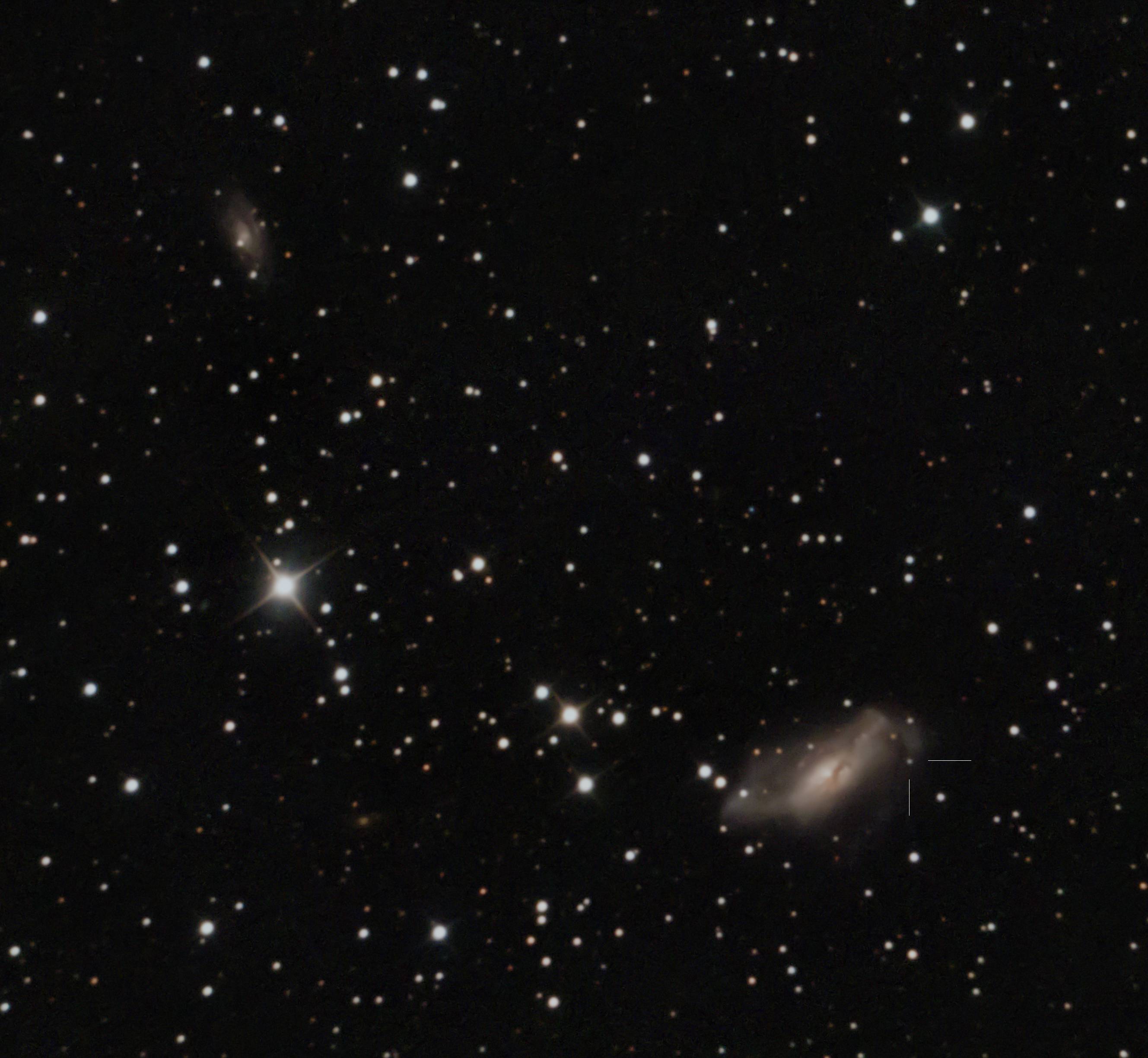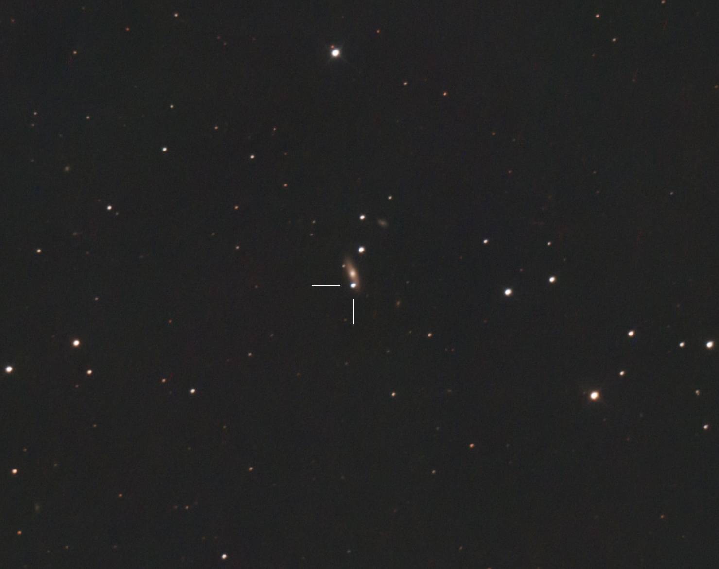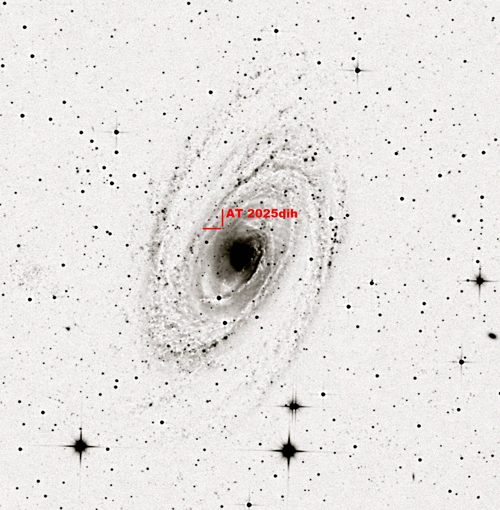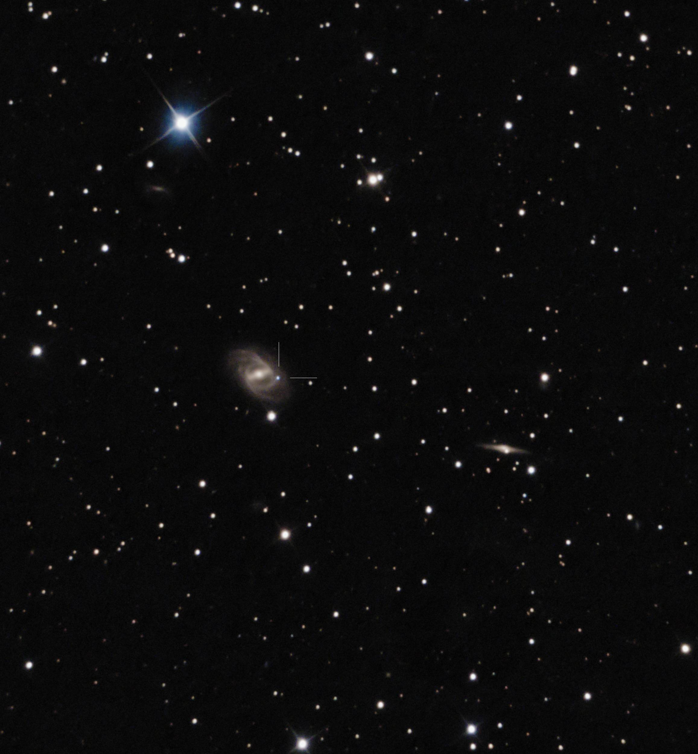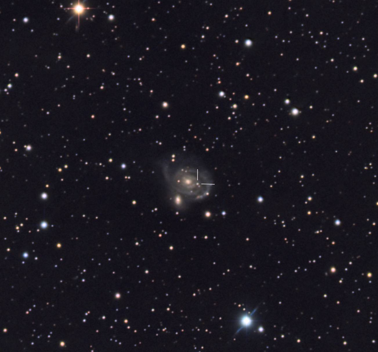 L’esperta coppia Mirco Villi e Michele Mazzucato rompe il ghiaccio nel 2025 e mette a segno una doppia scoperta sempre nell’ambito della collaborazione con i professionisti del CRTS Catalina, che utilizza il telescopio Cassegrain di 1,5 metri di diametro dell’osservatorio americano sul Mount Lemmon in Arizona. La prima scoperta è stata ottenuta la notte del 2 febbraio nella galassia a spirale barrata NGC180 posta nella costellazione dei Pesci a circa 230 milioni di anni luce di distanza. Al momento della scoperta il nuovo oggetto appariva molto debole, pari alla mag.+19. Il CRTS Catalina è stato molto rapido ad inserire la scoperta nel TNS battendo sul tempo gli americani di un altro programma professionale di ricerca supernovae denominato ZTF Zwicky Transient Facility, che avevano immortalato due giorni prima questo transiente con una luminosità pari alla mag.+19,7. Da un follow-up del 5 febbraio sempre di ZTF la luminosità era salita intorno alla mag.+18. La posizione della galassia ospite NGC180 in questo periodo dell’anno però è purtroppo molto sfavorevole, essendo visibile bassa sull’orizzonte Ovest subito dopo il tramonto. Per questo motivo non è stato possibile riprendere uno spettro di conferma e pertanto al nuovo transiente è rimasta la sigla provvisoria AT2025arw.