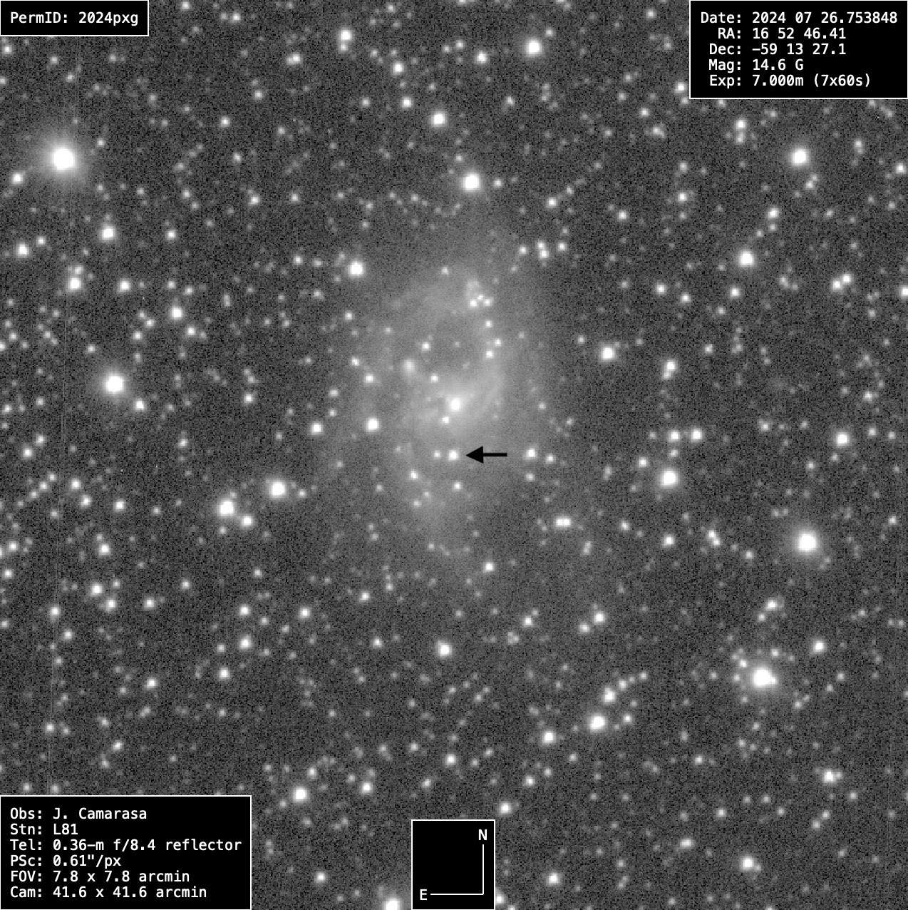 Nella stessa notte, gli astronomi americani dal Cerro Tololo Observatory con il SOAR Souther Astrophysical Research Telescope, un moderno telescopio da 4,10 metri con ottiche attive posto a 2.700 metri di altitudine sul Cerro Pachon in Cile, hanno ottenuto lo spettro di conferma. La SN2024pxg, questa la sigla definitiva assegnata, è una giovane supernova di tipo II scoperta 4 giorni dopo l’esplosione. Nei giorni seguenti la sua luminosità è aumentata leggermente fino a raggiungere la mag.+14,5. Questa è la seconda supernova conosciuta esplosa in NGC6221, la prima fu la SN1990W scoperta il 16 agosto 1990 dal famoso astrofilo australiano Robert Evans, che purtroppo ci ha lasciato nel novembre del 2022.
