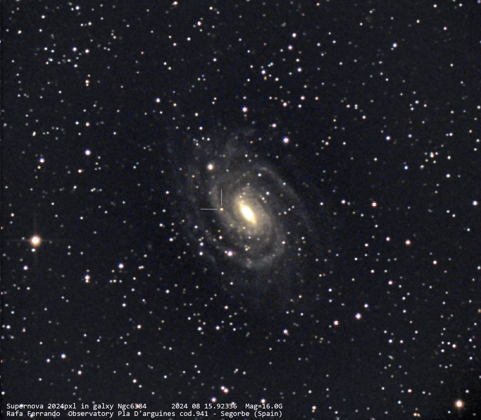 La seconda supernova del 23 luglio è stata invece scoperta dal programma professionale americano di ricerca supernovae Zwicky Transient Facility (ZTF) nella galassia a spirale barrata NGC6384 nella costellazione di Ofiuco a circa 80 milioni di anni luce di distanza. Nella notte seguente la scoperta, dal Siding Spring Observatory con l’ANU Telescope da 2,3 metri è stato ripreso lo spettro di conferma che ha permesso di classificare la SN2024pxl come una supernova di tipo Iax 02cx-like scoperta circa una settimana prima del massimo, che si è verificato nei primi giorni del mese di agosto intorno alla mag.+15,5. Le supernovae di tipo Iax sono transienti rari e peculiari, che prendono il nome dal prototipo di questo gruppo di oggetti, cioè la SN2002cx. Sono supernovae di solito più deboli e con righe nello spettro molto più strette rispetto ad una normale supernova di tipo Ia e sono associate a popolazioni stellari giovani. La loro interpretazione fisica è ancora in fase di approfondimento e sono perciò seguite con molto interesse dalla comunità astronomica internazionale. Questa è la terza supernova conosciuta esplosa in NGC6384. Le altre due sono state la SN2017drh scoperta il 3 maggio del 2017 dal programma professionale DTL40 di tipo Ia e la SN1971L scoperta il 24 giugno del 1971 da Logan di tipo I, che raggiunse la notevole mag.+12,8.