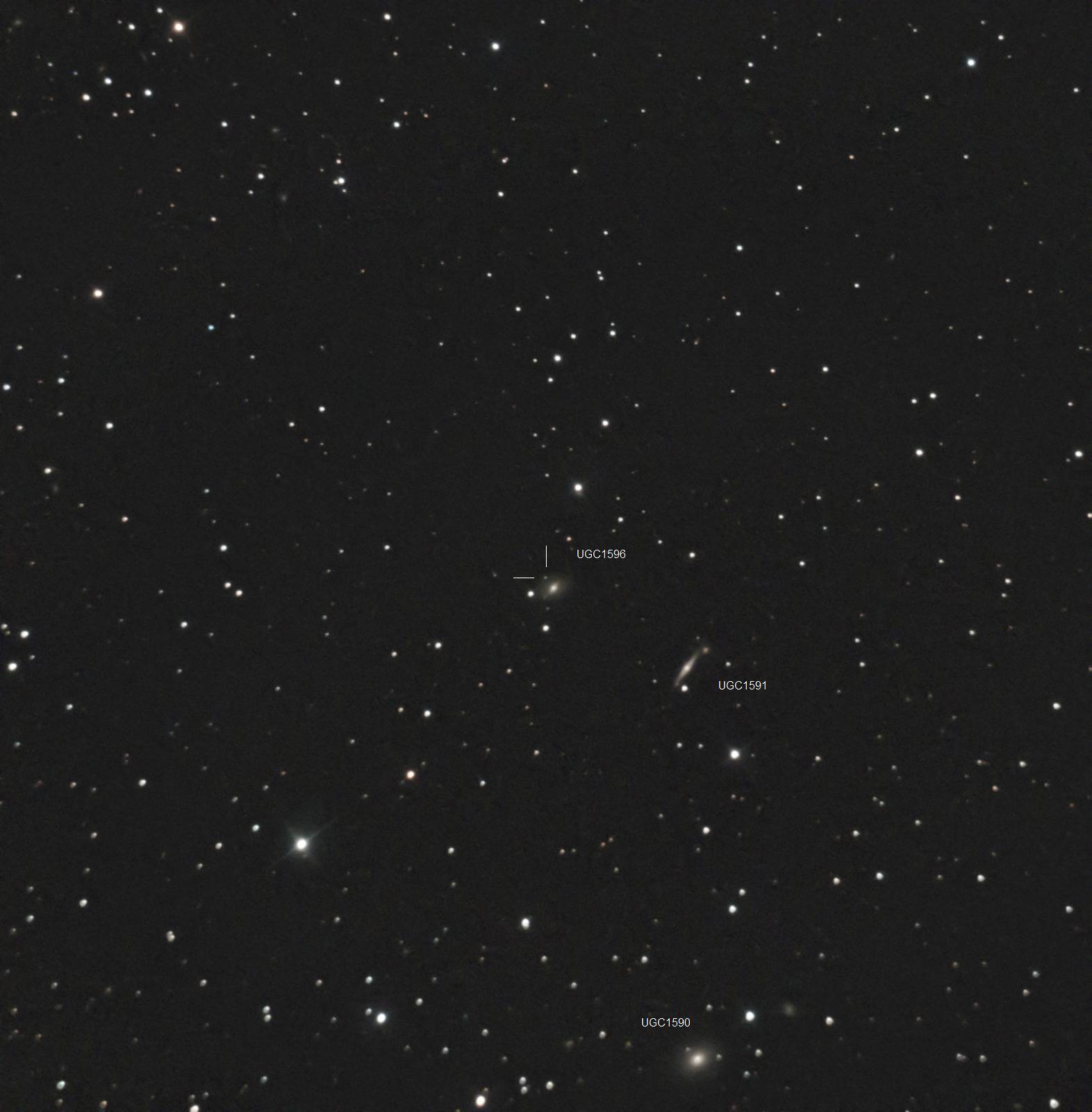 Scoperta quando mostrava una luminosità pari alla mag.+20,3 nei giorni la sua luminosità è aumentata fino a raggiungere intorno al 25 ottobre la mag.+17,5. Nella notte del 22 ottobre dall’Osservatorio di Mauna Kea nelle Isole Hawaii, con il telescopio UH88 da 2,2 metri di diametro, è stato ripreso lo spettro di conferma. Si tratta di una supernova di tipo Ia-91bg-like, una sottoclasse di supernova di tipo Ia che i cui soggetti si mostrano leggermente più deboli ed evolvono più rapidamente. Hanno gli spettri con righe più strette e presentano le righe del Calcio e del Titanio più intense e meno quelle del Ferro, rispetto ad una tradizionale supernova di tipo Ia. La galassia UGC1596 ha un modulo di distanza di pari a 34, se questa supernova fosse stata una normale tipo Ia, la sua luminosità sarebbe salita fino alla mag.+15 (34-19=15). Comunque la posizione della galassia ospite in questo periodo dell’anno è ottimale trovandosi quasi allo Zenit già in prima serata. Non sarà perciò difficile ottenere una buona immagine di questa supernova italo-americana insieme a questa interessante coppia di piccole galassie.
