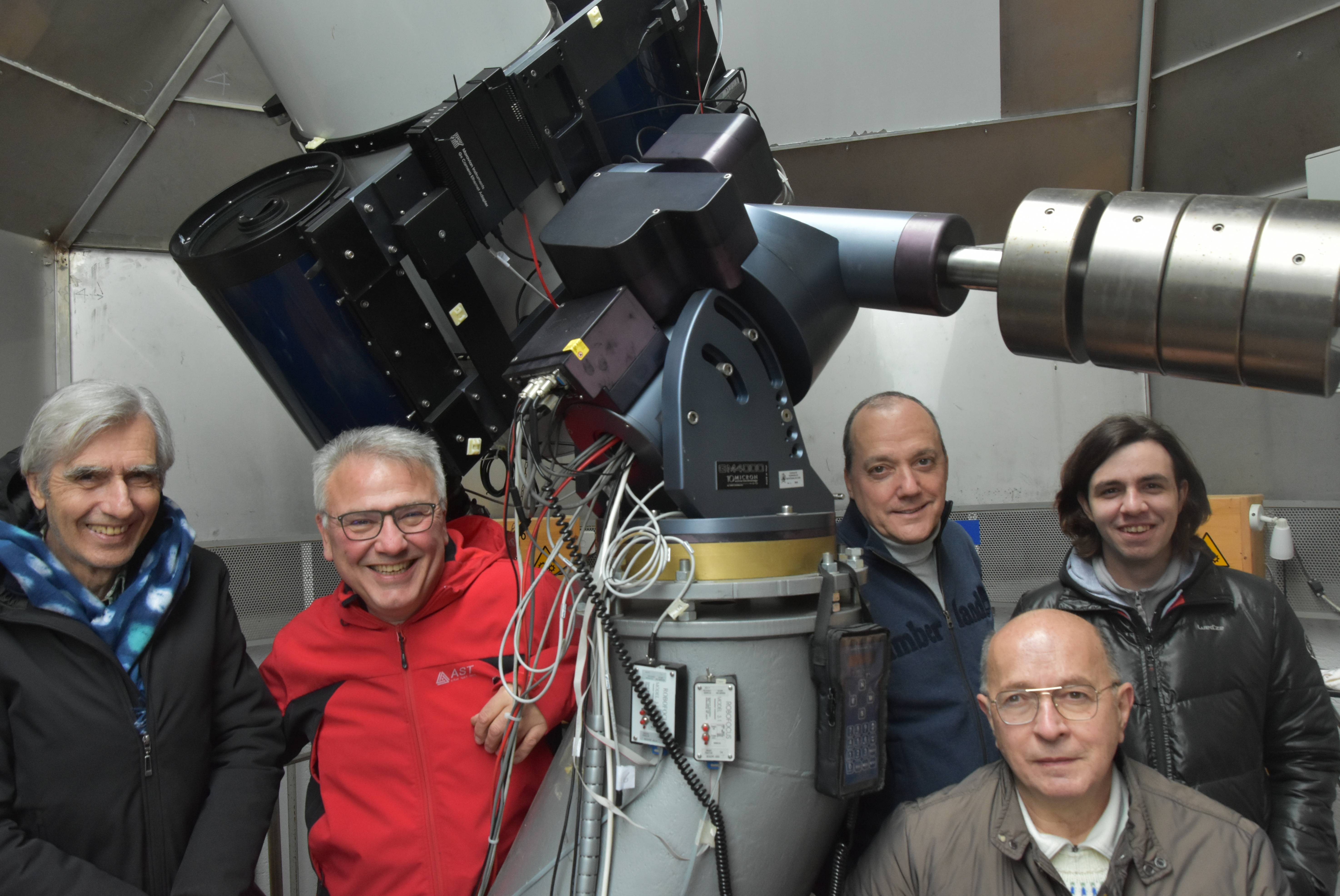 E’ giusto spendere alcune parole di elogio per gli amici di Monte Baldo per lo stupendo lavoro che stanno portando avanti da anni. La strumentazione di cui dispongono è di tutto rispetto, con un ottimo telescopio Dall-Kirkham da 40cm F.7 accoppiato ad una CCD KAF Moravian G4-9000. La loro attività di ricerca in ambito ISSP iniziò nel lontano 2012 quando ottennero la loro prima scoperta con la supernova SN2012fm nella galassia UGC3528, a cui seguì un’altra supernova l’anno successivo la SN2013ff nella galassia NGC2748. Le supernovae nel palmares dell’Osservatorio di Monte Baldo sono in realtà tre, ottennero infatti nel 2020 anche la SN2020gpe nella galassia NGC6214. Dal 2016 però il loro campo di ricerca preferito è virato verso le Novae Extragalattiche, concentrando i loro sforzi principalmente sulle tre galassie più vicine M31, M33 e M81. I successi ottenuti, diciotto Novae in M31 e sette Novae in M81, hanno permesso all’Osservatorio di Monte Baldo di diventare una delle realtà amatoriali più importanti a livello mondiale nella campo della ricerca di Novae Extragalattiche, secondi solo al grande Kamil Hornoch e agli incredibili cinesi del programma XOSS. Per fare i complimenti agli amici di Monte Baldo per questi numerosi successi e con la speranza che la strada intrapresa porti ancora a grandi soddisfazioni, pubblichiamo una foto che ritrae tutti i membri del team, che in questi anni hanno contribuito a questi importanti successi: da destra Vittorio Andreoli, Claudio Marangoni, Raffaele Belligoli, Flavio Castellani e Fernando Marziali.