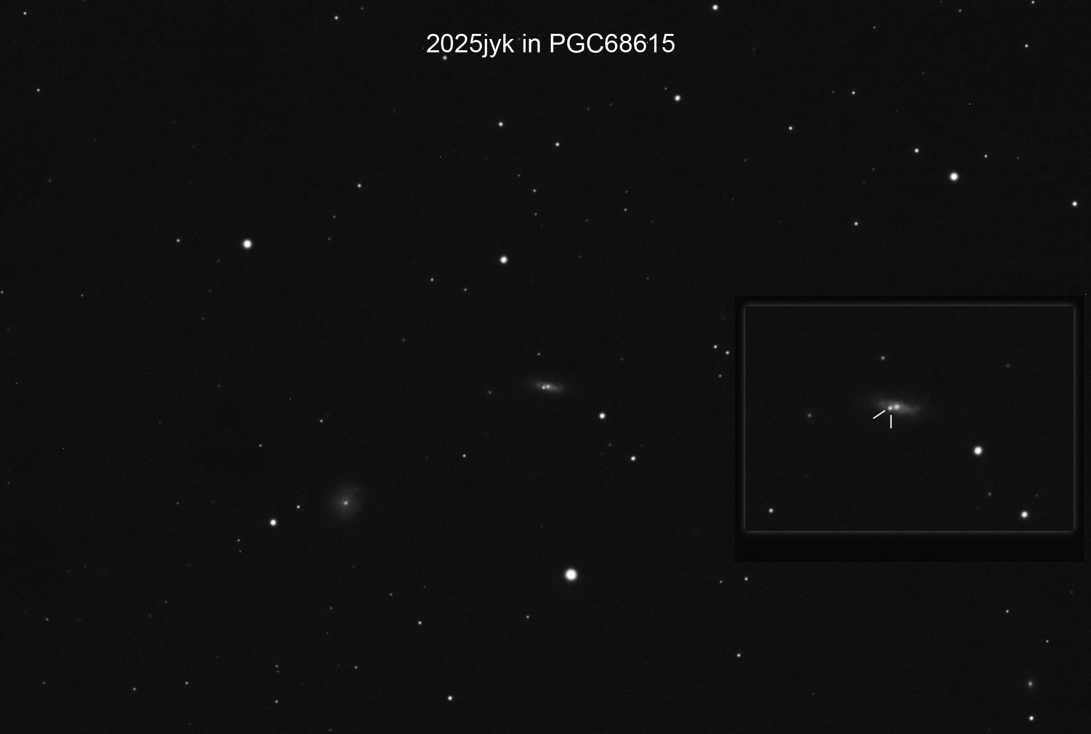 Il team del Sumdo Observatory con questa supernova raggiunge quota 5 scoperta nel 2025 e si posiziona subito dietro agli altri cinesi del programma XOSS e davanti al nostro Giancarlo Cortini che con 3 scoperte nel 2025 occupa il terzo gradino del podio. Tornando a questa supernova, al momento della scoperta mostrava una luminosità pari alla mag.+18,5 e nei giorni seguenti è aumentata di luminosità fino a raggiungere il massimo intorno alla mag.+17.