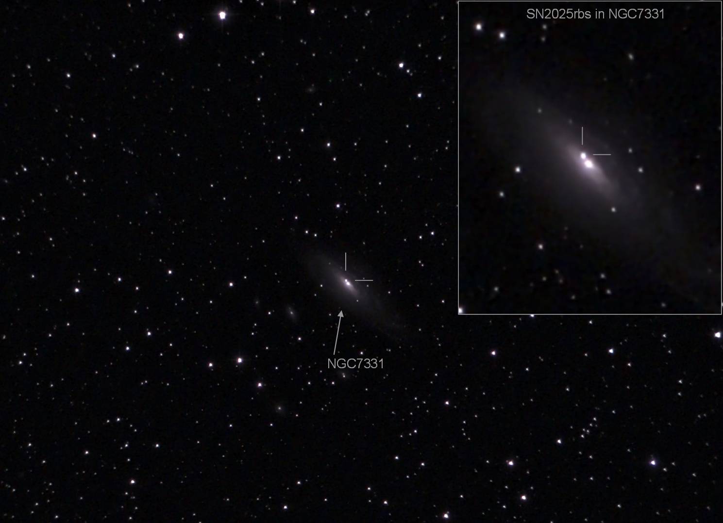 Chiudiamo la rubrica in bellezza con una supernovae molto luminosa, che sta catalizzando le attenzioni degli astrofotografi, esplosa in una stupenda galassia a spirale. Stiamo parlando della SN2025rbs scoperta la notte del 14 luglio dal programma professionale denominato Gravitational-ware Optical Transient Observer (GOTO) nella bellissima galassia a spirale NGC7331 posta nella costellazione di Pegaso a circa 40 milioni di anni luce di distanza. NGC7331 è una delle galassie più luminose, che stranamente Messier non incluse nel suo famoso catalogo. Intorno a lei sono presenti almeno cinque piccole galassie satelliti ed a soli 30’ a Sud troviamo il famoso Quintetto di Stephan. Al momento della scoperta il nuovo transiente mostrava una luminosità pari alla mag.+17, ma nei giorni seguente la sua luminosità è andata costantemente ad aumentare fino a raggiungere il massimo intorno al 28 luglio sfiorando la notevole mag.+12 e diventando la supernova più luminosa del 2025. I primi a riprendere lo spettro di conferma sono stati gli astronomi americani del Haleakala Observatory nelle Isole Hawaii con il Faulkes Telescope North da 2 metri di diametro. La SN2025rbs è una supernova di tipo Ia scoperta circa due settimane prima del massimo di luminosità con i gas eiettati dall’esplosione che viaggiano ad una velocità di circa 15.000 km/s. Abbiamo pertanto una galassia molto fotogenica con all’interno una supernova molto luminosa che ci permetterà di ottenere delle stupende immagini. Un cocktail perfetto che però è leggermente disturbato da un particolare importante: la supernova è posizionata molto vicino al nucleo della galassia ospite. La supernova è pertanto ben visibile in pose brevi che però non evidenziano la stupenda struttura dei bracci a spirale. Se aumentiamo il tempo di posa la bellezza della galassia viene fuori in tutto il suo splendore, ma la supernova rimane soffocata dal nucleo luminoso della galassia. Dobbiamo pertanto trovare il giusto compromesso che permetta di evidenziare entrambi. Questa è la quarta supernova esplosa in NGC7331. Le prime tre sono state rispettivamente la SN1959D di tipo II scoperta il 28 giugno 1959 dall’astronomo americano Milton Humason, la SN2013bu di tipo II scoperta il 21 aprile 2013 dall’astrofilo giapponese Koichi Itagaki e la SN2014C di tipo Ib scoperta il 5 gennaio 2014 dal programma professionale denominato Lick Observatory Supernova Search (LOSS).