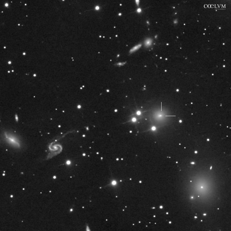 La SN2024kce, questa la sigla definitiva assegnata, è una giovane supernova di tipo Ia-pec, dove la peculiarità si evidenzia nella bassa luminosità e nella forte presenza di Calcio. I gas eiettati dall’esplosione viaggiano ad una velocità di circa 15.600 Km/s. Vista la posizione del nuovo transiente, la domanda è sorta subito spontanea: si trattava di una supernova esplosa in Messier 49 oppure nella piccola galassia nana situata a circa 13’ a Nord dal centro di M49? In realtà anche se M49 è una galassia ellittica molto estesa con un diametro di circa 160.000 anni luce, è molto improbabile che il suo alone più esterno possa arrivare così lontano. Inoltre il redshift della supernova riporta un valore di 0,003 che corrisponde ad una distanza di circa 40 milioni di anni luce. M49 si trova invece ad una distanza di circa 55 milioni di anni luce. Alla luce di questi dati, la supernova è quasi sicuramente esplosa nella parte meridionale della piccola galassia nana situata solo prospetticamente vicino ad M49 ed anche se più vicina in termini di distanza (quasi 15 milioni di anni luce), risulta molto poco appariscente e quasi scompare, sovrastata dalla grande estensione del gigante M49.