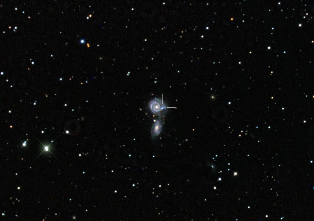 Da prima dell’alba, passiamo a subito dopo il tramonto per osservare una luminosa supernova situata in una stupenda e fotogenica coppia di galassie interagenti, inserite nel catalogo ARP al numero 271. Si tratta delle due galassie a spirale denominate NGC 5426 e NGC 5427, poste nella costellazione della Vergine a circa 120 milioni di anni luce di distanza.