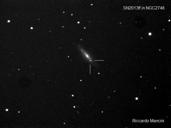 La prima è la SN2013ff individuata la notte del 31 Agosto da Raffaele Belligoli e Flavio Castellani dell’Osservatorio di Monte Baldo (VR) alla loro seconda scoperta. La galassia ospite è la bella spirale barrata NGC2748 posta a circa 70 milioni di anni luce nella costellazione della Giraffa al confine con quella del Drago. La galassia è circumpolare situata a soli 14° dal polo e perciò visibile tutta la notte. Al momento della scoperta la supernova appariva di mag. +16 e nei giorni seguenti è aumentata fino a raggiungere la mag. +15 diventando un facile oggetto da seguire già in prima serata. A questa supernova è stata anche assegnata la scoperta indipendente a Giancarlo Cortini che l’aveva immortalata in una sua immagine ottenuta la notte seguente, all’insaputa della scoperta ufficiale messa a segno dai veronesi. Lo spettro ripreso il 2 Settembre da Asiago con il telescopio Copernico ha evidenziato che si tratta di una supernova di tipo Ic, quindi una supernova non comunissima, scoperta poco prima del massimo di luminosità. Questa è la seconda supernova che esplode in NGC2748. La prima fu la SN1985A di tipo I che raggiunse la mag. +14,5.
