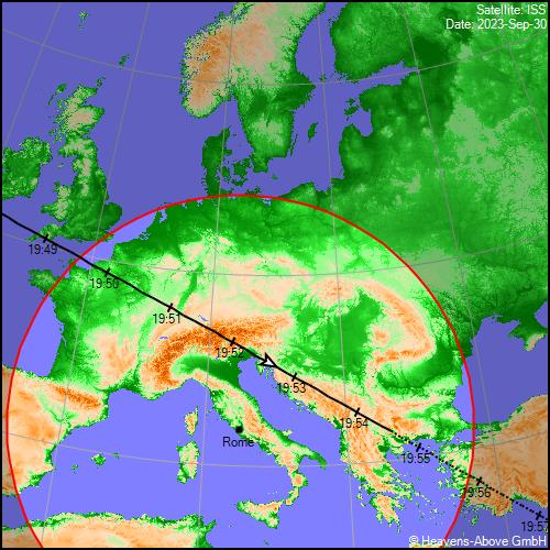 L’ultimo transito notevole si avrà il 30 Settembre, osservabile al meglio dal Nord-Est e regioni Adriatiche, dalle 19:47 alle 19:54, da NO ad E. La ISS avrà una magnitudine massima a -3.2.