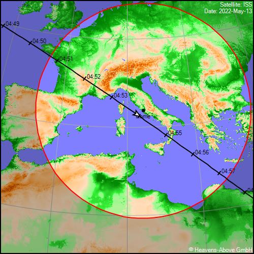 Il 28 Maggio avremo il primo dei due migliori transiti serali del mese, dalle 22:12 alle 22:19, con magnitudine di picco a -3.6, visibile da tutta Italia da NO ad ESE.