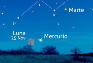Nell’ultimo dei tre giorni indicati, il 25 novembre, alla medesima ora, vedremo la Luna ora molto più sottile (fase del 2,6%) e ben più bassa sull’orizzonte di est-sudest (appena 2° 40’) in stretta congiunzione con Mercurio. I due oggetti si abbracceranno in una congiunzione di 2° di separazione, tra le stelle della Bilancia.