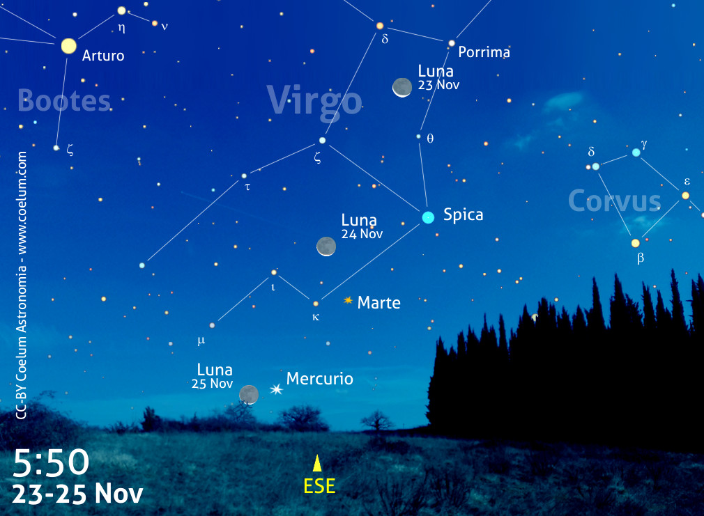 Il giorno seguente, il 24 novembre, alla stessa ora, la situazione per Spica e i due pianeti sarà sostanzialmente immutata (avranno guadagnato una manciata di primi di altezza sull’orizzonte) mentre la Luna (fase dell’8%) ci apparirà ora più falciforme e si sarà posizionata più in prossimità del pianeta Marte, avendo già sorpassato Spica, formando con questi ultimi due astri un bel triangolo (la Luna si troverà a 4° 45’ da Marte).