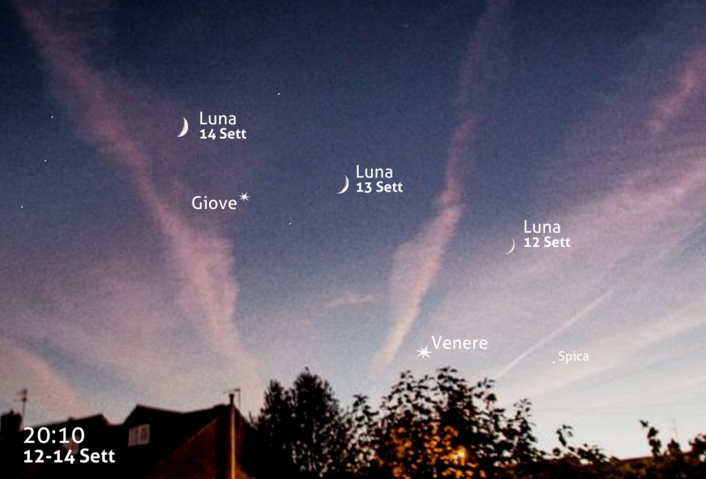 La sera del 12 settembre, i tre astri formano un bel triangolo, quasi isoscele, con Venere posto nella Vergine a 9°20’ a sudovest della Luna, e Giove, nella Bilancia, a 19°45’ a ovest-nordovest da essa, a formare il vertice del triangolo.
