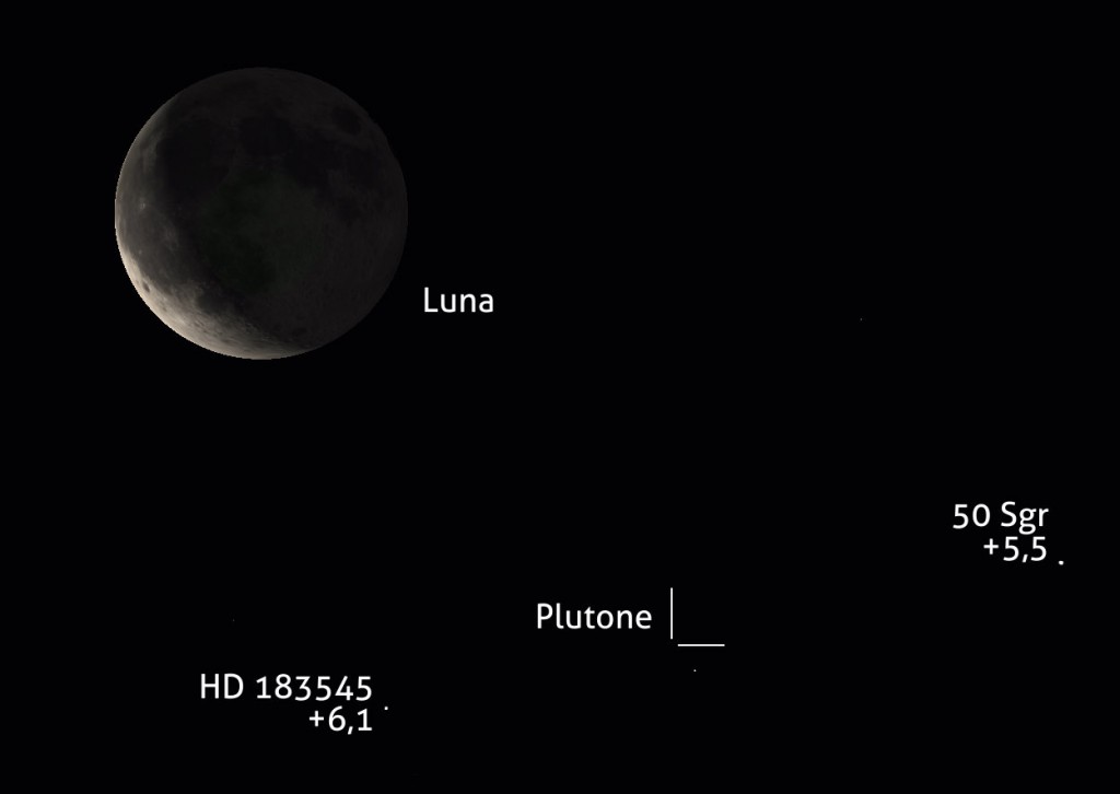 Plutone sarà posto a circa 45’ a sudovest del lembo in ombra del nostro satellite naturale. Un occasione comunque per tentarne l’osservazione strumentale.