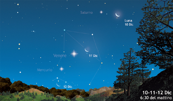 Le mattine del 10, 11 e 12 dicembre, poco prima dell’alba sull’orizzonte sudest, si potrà godere della vista di Mercurio, Venere e Saturno, allineati lungo il tratto di eclittica che attraversa Scorpione, Bilancia e Vergine. A movimentare la scena, una falce di Luna molto sottile attraverserà il campo dando luogo ad una serie di congiunzioni più o meno larghe. All’ora indicata Mercurio sarà alto +6°, Venere +11° e Saturno +25°.