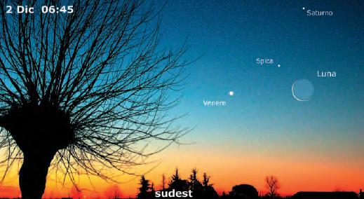 Una congiunzione molto bella, ma di difficile osservazione (sarà necessario trovare un cielo limpido e completamente sgombro nei pressi dell’orizzonte) si avrà alle 6:45 del 2 dicembre quando Venere verrà raggiunta da una falce di Luna sottile (fase 15%). A quell’ora i due oggetti saranno alti circa +25° sull’orizzonte sudest, con la Luna 9° a ovest di Venere (nell’orientamento altazimutale). A completare il suggestivo panorama ci sarà la presenza di Spica (alfa Virginis, mag. +1,0) situata 3,5° a nordest della Luna e, 13° ancora più a nord, di Saturno (mag. +0,9). Naturalmente, con l’uso di appositi filtri sarà possibile seguire l’evolvere della congiunzione anche con l’aumentare della luminosità del cielo ed effettuare delle riprese a grande campo veramente d’effetto.