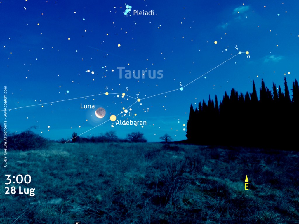 Il 28 luglio, dopo essere sorte poco dopo le due, all’orario indicato potremo osservare la Luna (fase del 20%) e la stella Aldebaran (alfa Tauri, mag. +0,9) separate di 1° e mezzo circa, con la Luna posta a est della stella dallo spiccato colore arancione.