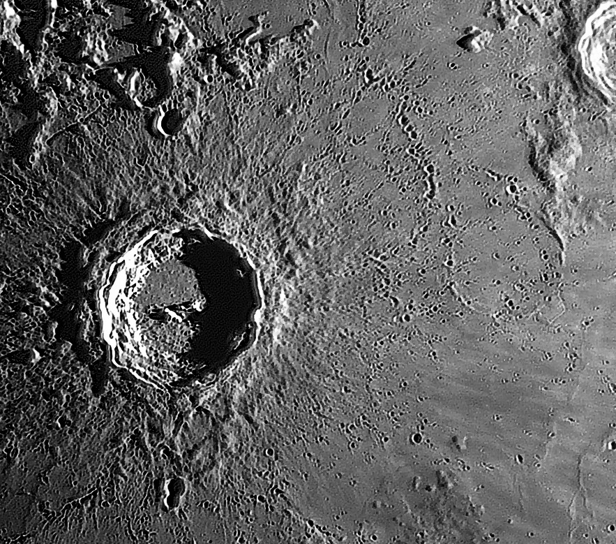 Come seconda proposta consigliamo per la serata del 5 maggio a partire dalle ore 21,30 circa l’osservazione di Copernicus, eccezionale struttura crateriforme di 95 km di diametro contornata da un imponente sistema di pareti terrazzate alte 3800 metri da cui si diparte una notevole raggiera estesa radialmente in ogni direzione anche per parecchie centinaia di chilometri. Volendo intraprendere un approfondito e dettagliato studio di Copernicus, l’osservazione dovrebbe essere estesa a tutte le fasi lunari in cui la linea del terminatore venga a coincidere con questa eccezionale struttura.