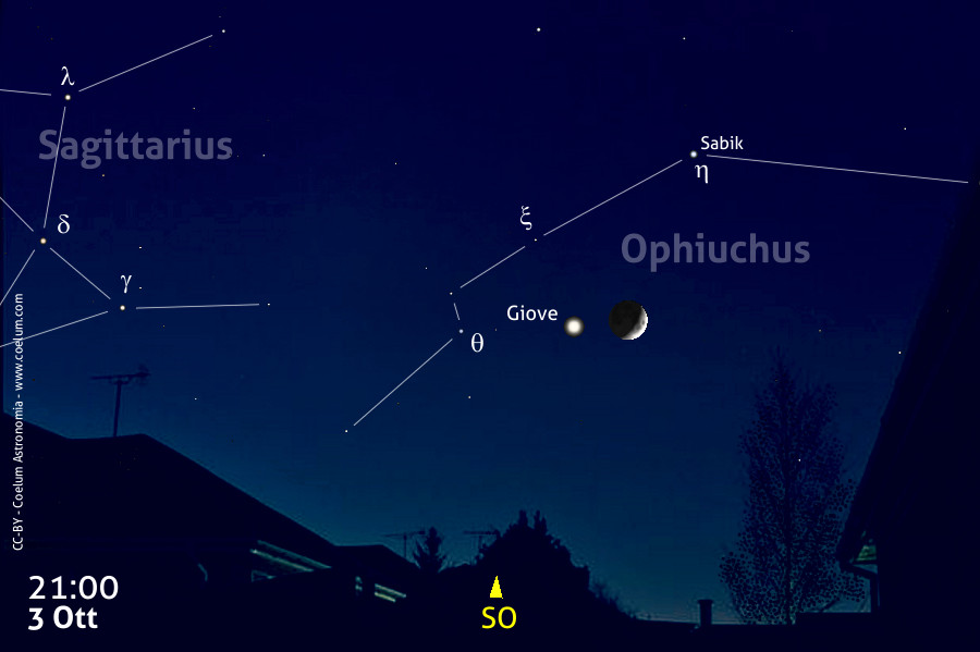 Iniziamo la sera del 3 ottobre, alle ore 21:00 circa, quando una falce di Luna (fase del 31%) entrerà in congiunzione stretta con il pianeta Giove (mag. –2), con la Luna che si troverà a circa 1° 48’ a ovest del pianeta.