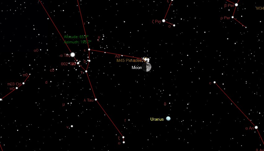 Il satellite al primo quarto, quindi ben luminoso, “costeggerà” l’ammasso M45 non allontanandosi mai troppo neanche nelle ore successive quando in coppia staranno scendendo verso ovest. Il tramonto sotto l’orizzonte è previsto subito dopo le 01:00 del giorno successivo.