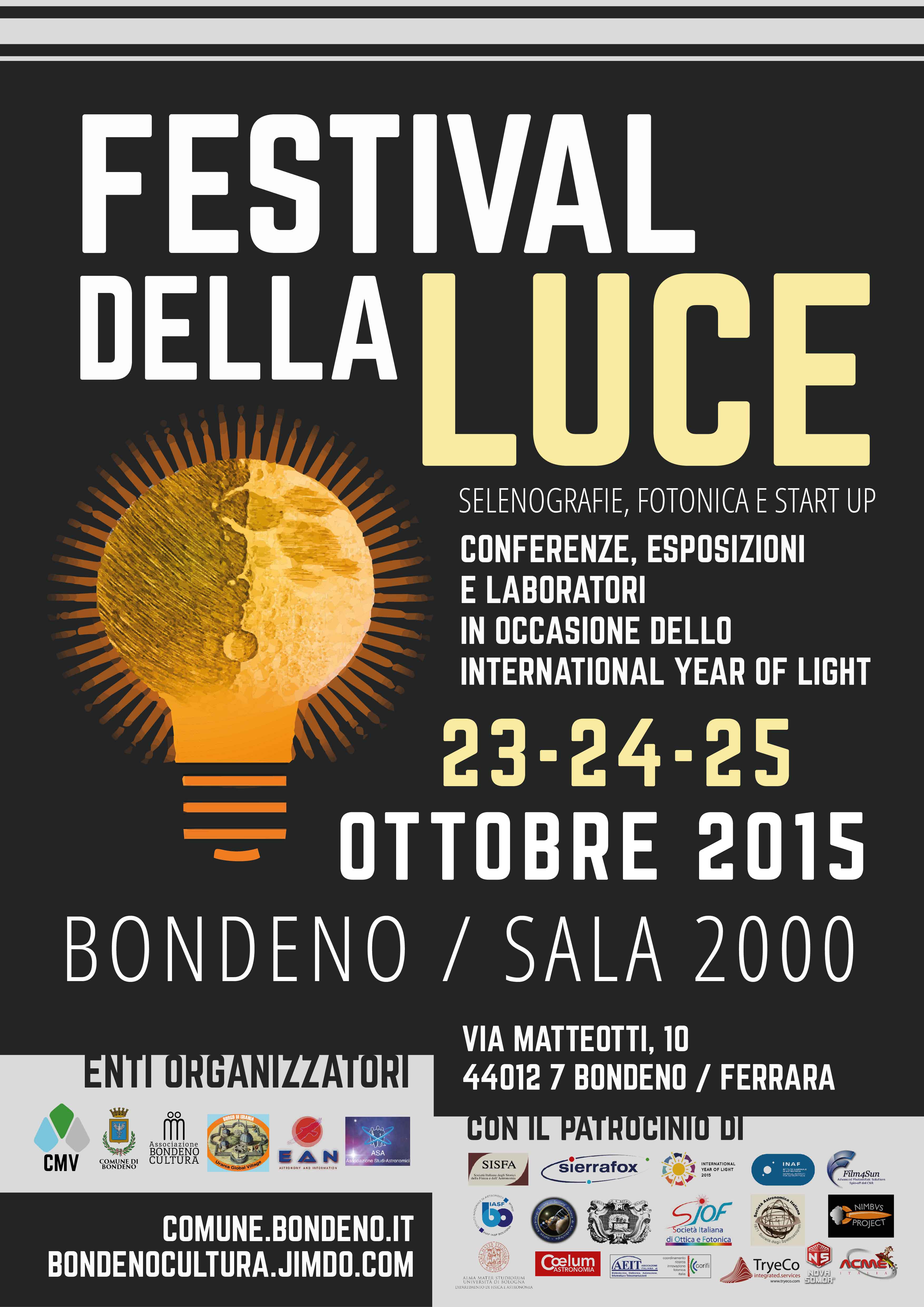 Bondeno ospiterà – il 23, 24 e 25 ottobre prossimi – il primo “Festival Internazionale della luce” nell’anno che l’Onu ha dedicato proprio a questo tema. Special guest dell’evento Pietro Aliprandi, l’astronauta 25enne di Conegliano selezionato (unico italiano) per la prima missione su Marte (Mars One) e Claudio Marazzini, presidente dell’Accademia della Crusca, massimo esperto di lingua italiana (appassionato di toponomastica lunare).