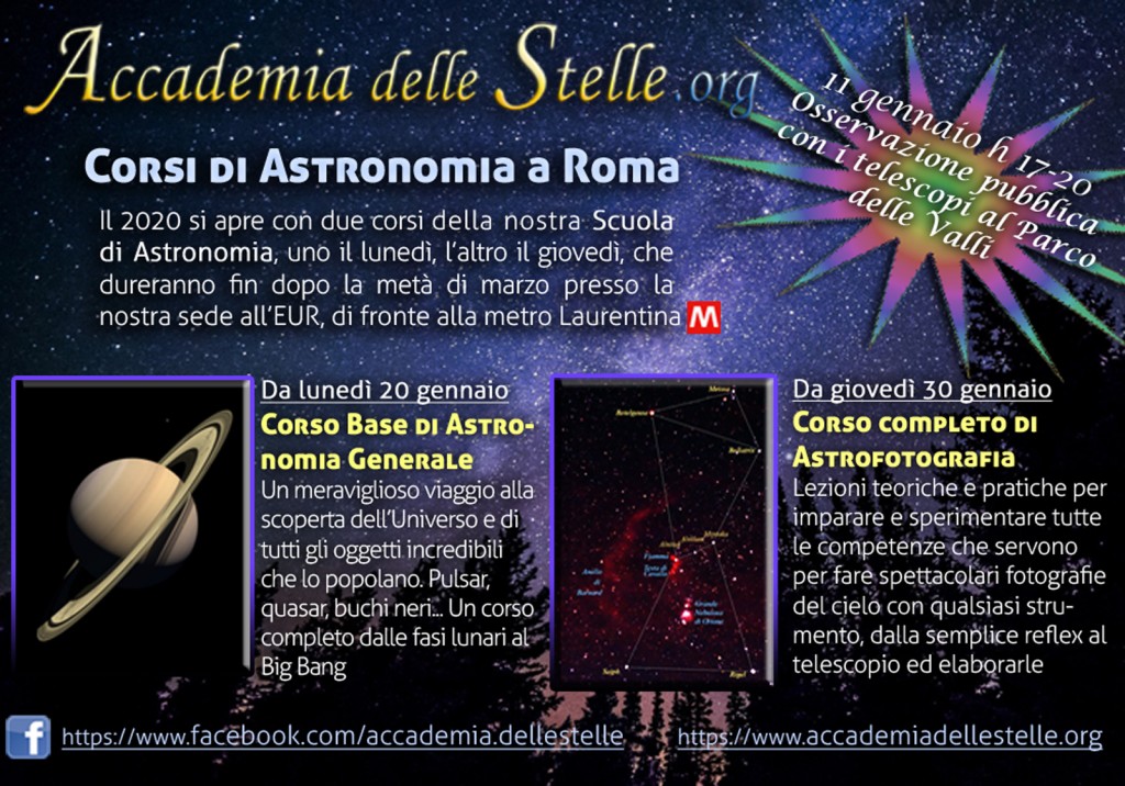 Il 2020 si apre con due corsi della nostra Scuola di Astronomia, uno il lunedì, l’altro il giovedì, che dureranno fin dopo la metà di marzo presso la nostra sede all’EUR, di fronte alla metro Laurentina.