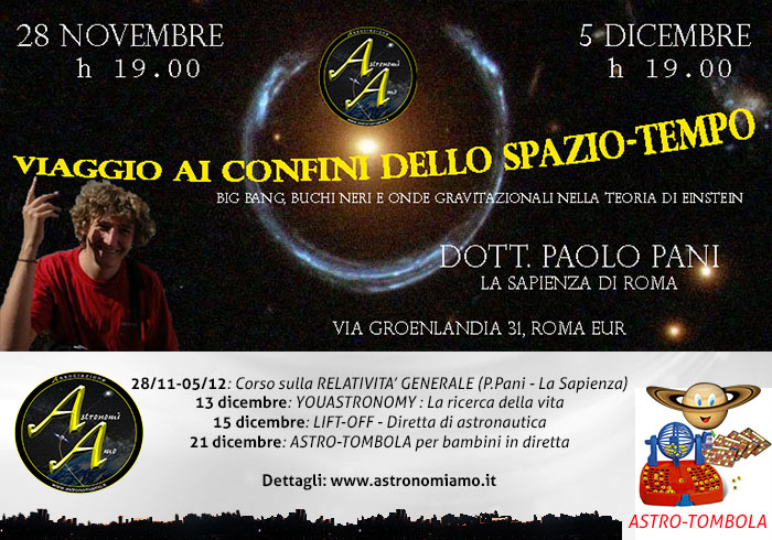 LocandinaCoelum28 novembre 2016 – 5 dicembre 2016: Corso sulla RELATIVITA’ GENERALE (P. Pani – La Sapienza). VIAGGIO AI CONFINI DELLO SPAZIO-TEMPO – Big Bang, buchi neri e onde gravitazionali nella Teoria di Heinstein.
