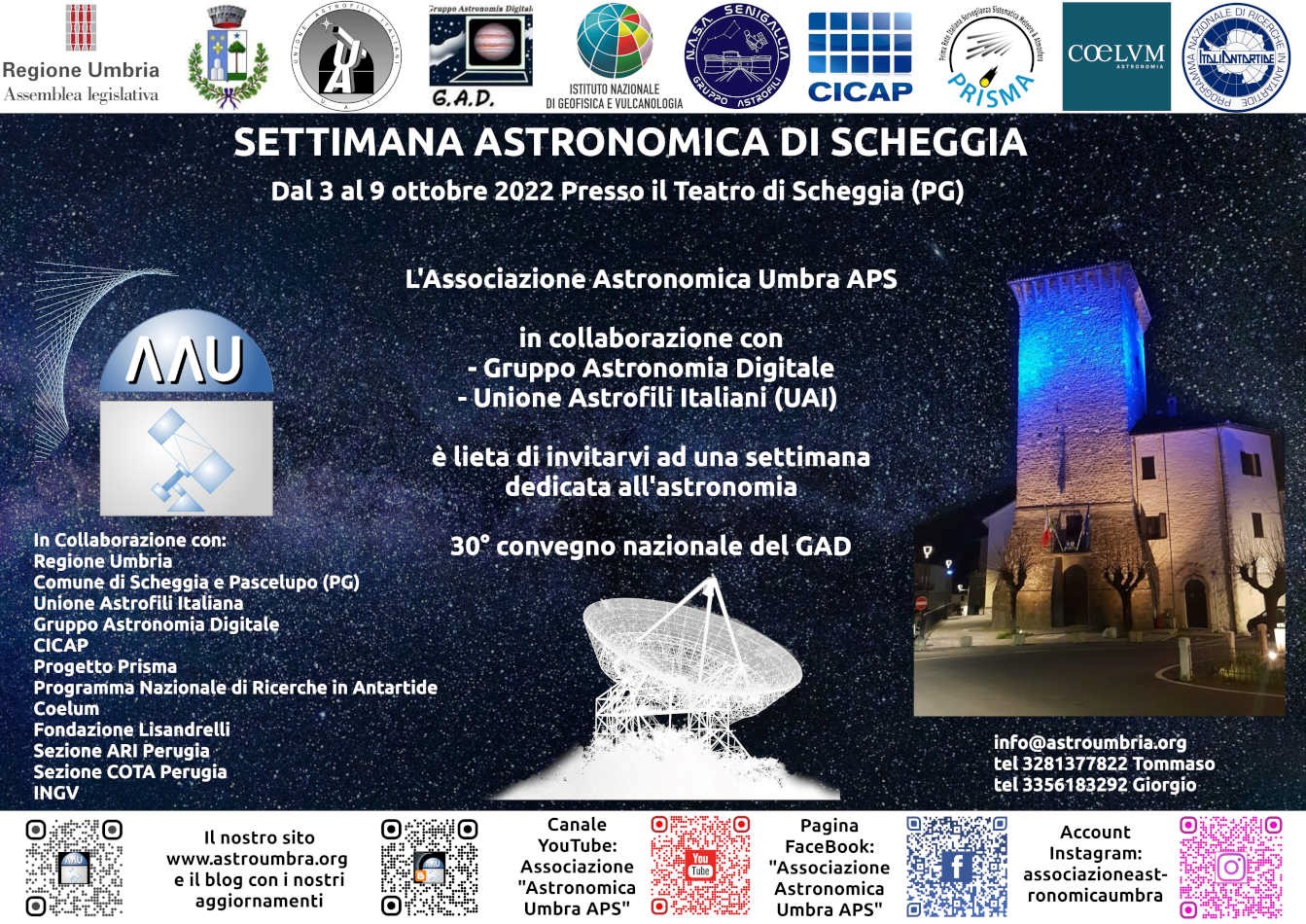 Dal 3 Ottobre 2022 al 09 Ottobre 2022 Scheggia (PG) si immerge nell’Astronomia e per tutta la settimana ospiterà incontri dedicati alla divulgazione scientifica principalmente all’ Astronomia e alla Geofisica.
