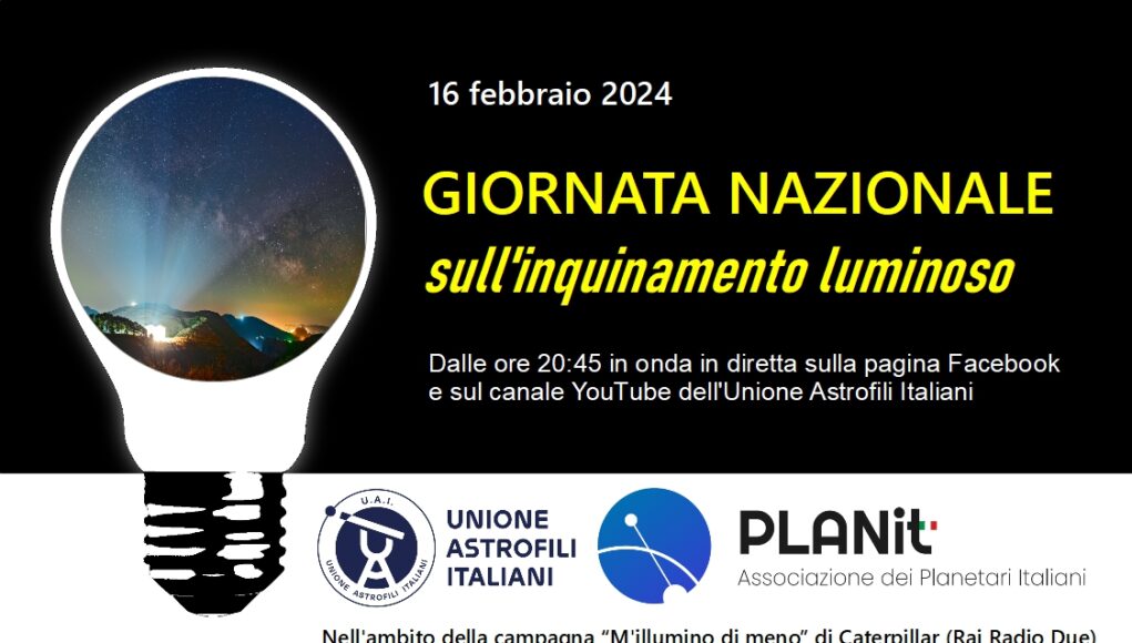 La Giornata Nazionale sull’Inquinamento luminoso rientra nel calendario astrofilo UAI 2024, che raccoglie tutti gli eventi di grande interesse per gli appassionati di astronomia, e nel calendario delle attività dei planetari italiani. Celebrata dal 1993 nel mese di ottobre, da quest’anno l’iniziativa è stata riprogrammata a febbraio per creare una sinergia con la campagna “M’Illumino di Meno” organizzata dal programma radiofonico Caterpillar, di Rai Radio Due. L’obiettivo della collaborazione è includere alla campagna di sensibilizzazione – incentrata sul risparmio energetico e sugli stili di vita sostenibili – anche la tematica dell’inquinamento luminoso. Venerdì 16 febbraio – proprio al termine della trasmissione radiofonica, che ha ospitato nei giorni scorsi interventi a cura degli esperti dell’UAI, di PLANit e INAF – andrà in onda, in diretta sulla pagina Facebook e sul canale YouTube dell’Unione Astrofili Italiani, un evento dedicato al tema dell’inquinamento luminoso.