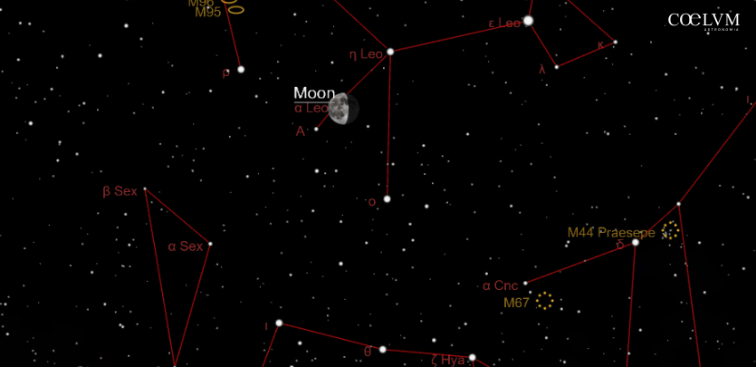 Il 10 Dicembre 2025 la Luna in fase di 20,6 giorni ad un’altezza di +38° alle ore 08:54 inizierà ad occultare la stella Regolo col suo bordo ovest-nordovest con egresso dall’opposto bordo orientale alle ore 09:50.