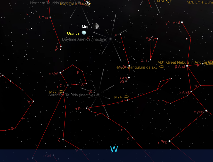 Alle ore 22:10 del 5 Febbraio il pianeta Urano sarà in congiunzione con la Luna in fase di 8 giorni ad un’altezza di +39° ma con una separazione piuttosto larga pari a 4,7°.