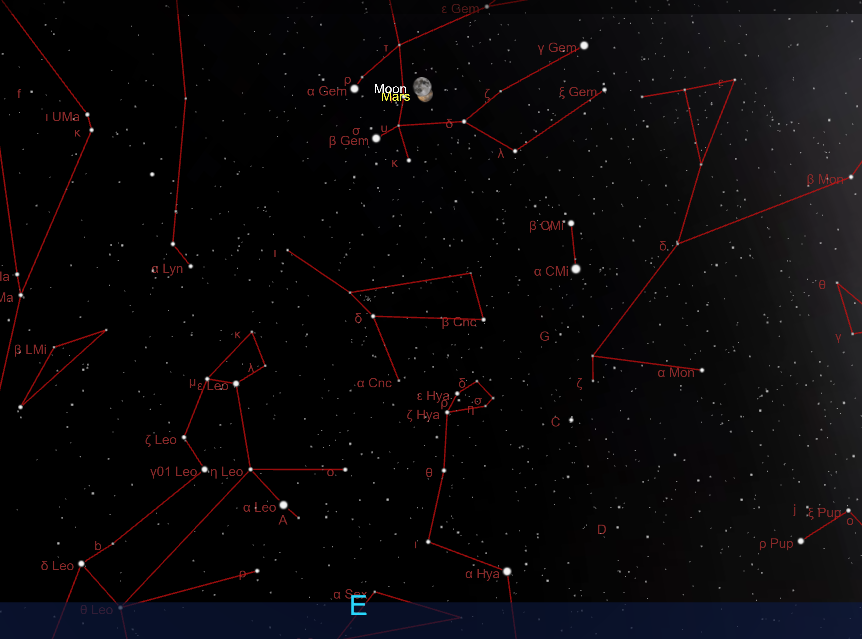 Alle ore 20:35 del 9 Febbraio potremo assistere alla spettacolare congiunzione ravvicinata fra il pianeta Marte ed il nostro satellite in fase di 12 giorni ad un’altezza di +64/65°, pertanto nelle migliori condizioni osservative. La separazione fra i due corpi celesti sarà di soli 0°34/0°36 circa, quanto basta per godersi lo spettacolo e anche per interessanti riprese fotografiche.