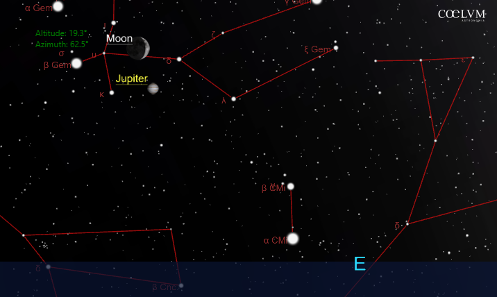 Alle ore 14:39 del 20 Maggio 2026 congiunzione (sep. 2°44’) fra il pianeta Giove e la Luna in fase di 4,3 giorni ad un’altezza di +57° ma con la scomoda presenza del Sole alla distanza di circa 52°, rendendo pertanto indispensabili tutte le precauzioni per evitare danni irreversibili alla propria vista.
