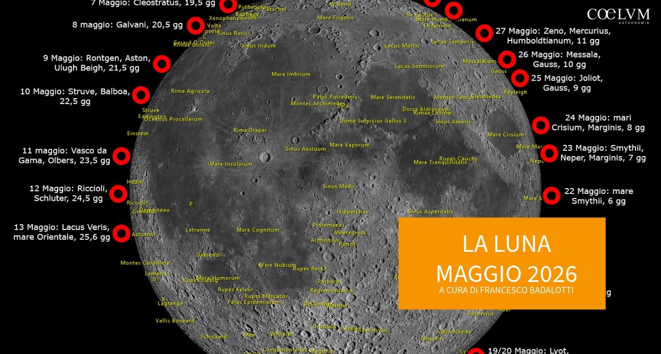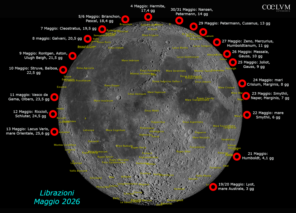 Superato il Plenilunio, la fase calante porterà il nostro satellite a ridurre sempre più la frazione di suolo lunare illuminata dal Sole passando alla fase di Ultimo Quarto alle ore 23:11 del 9 Maggio 2026 ma a -37° sotto l’orizzonte. Per eventuali osservazioni di questa fase col telescopio basterà attendere la notte del 10 Maggio quando sorgerà alle ore 02:36. Col procedere della fase calante la Luna si ridurrà progressivamente ad una falce sempre più sottile sprofondando nelle ore della notte fino al Novilunio del 16 Maggio 2026 alle ore 22:01. Come sempre accade ormai da 4,5 miliardi di anni il nostro satellite vedrà la ripartenza di un nuovo ciclo lunare con la contestuale progressiva illuminazione di una quota sempre più ampia della sua superficie da parte del Sole, dalla più sottile falce fino al Primo Quarto che si avrà alle ore 13:11 del 23 Maggio 2026 in fase di 6,6 giorni appena sopra l’orizzonte (+3°39’), dopo essere sorta alle 12:46. Per osservare al telescopio basterà attendere poche ore, fino alle 21/21:30 circa (altezza +43°), andando poi a tramontare intorno alle 02:00 della notte seguente. Fra le innumerevoli strutture lungo il terminatore la scelta potrebbe cadere su Aristoteles, Eudoxus e Alexander situati immediatamente a nord dei monti Caucasus, fra i mari Frigoris e Serenitatis.