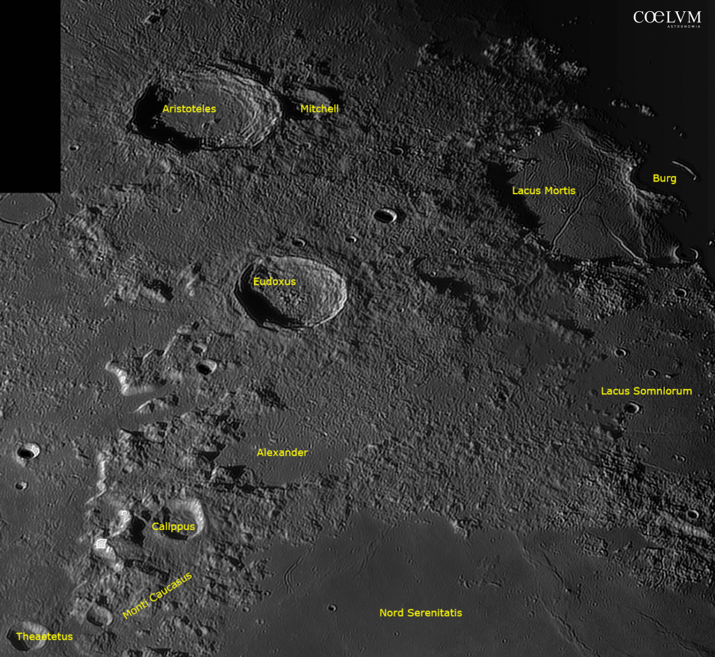 Iniziando dall’antichissimo Alexander, di 63 km di diametro con pareti notevolmente degradate alte circa 500/600 m ma completamente mancanti sul lato est-nordest, la sua formazione viene ricondotta al periodo geologico Pre Nectariano collocato da 4,5 a 3,9 miliardi di anni fa. La platea si presenta cosparsa da innumerevoli minuscoli craterini anche raggruppati in vari allineamenti. Poco a nord vediamo il vicino Eudoxus di 68 km di diametro contornato da una cerchia di pareti relativamente terrazzate alte fino a circa 3700/3800 m ma non eccessivamente danneggiate. La formazione di questa struttura crateriforme, la meno antica fra quelle qui prese in esame, viene ricondotta al periodo geologico Copernicano collocato a non oltre 1,1 miliardi di anni fa. Un’ampia area del fondo di Eudoxus è occupata da numerosi rilievi in posizione centrale che vanno quasi ad unirsi ad altrettante analoghe strutture presenti alla base interna delle pareti di Eudoxus. Superata un’ampia area ad anfiteatro (purtroppo priva di denominazione ufficiale) vediamo ora Aristoteles di 88 km di diametro circondato da pareti terrazzate piuttosto elevate di circa 4000 m ancora in buono stato di conservazione. Questo cratere risale al periodo geologico Eratosteniano collocato da 3,2 a 1,1 miliardi di anni fa. L’ampia platea di Aristoteles si presenta con innumerevoli rilievi collinari lungo la base interna delle pareti oltre ad alcune basse colline in prossimità del centro del cratere. Dalle pareti settentrionali di Aristoteles si possono individuare innumerevoli allineamenti di piccoli craterini e lunghe linee di creste che si estendono radialmente nell’adiacente mare Frigoris.