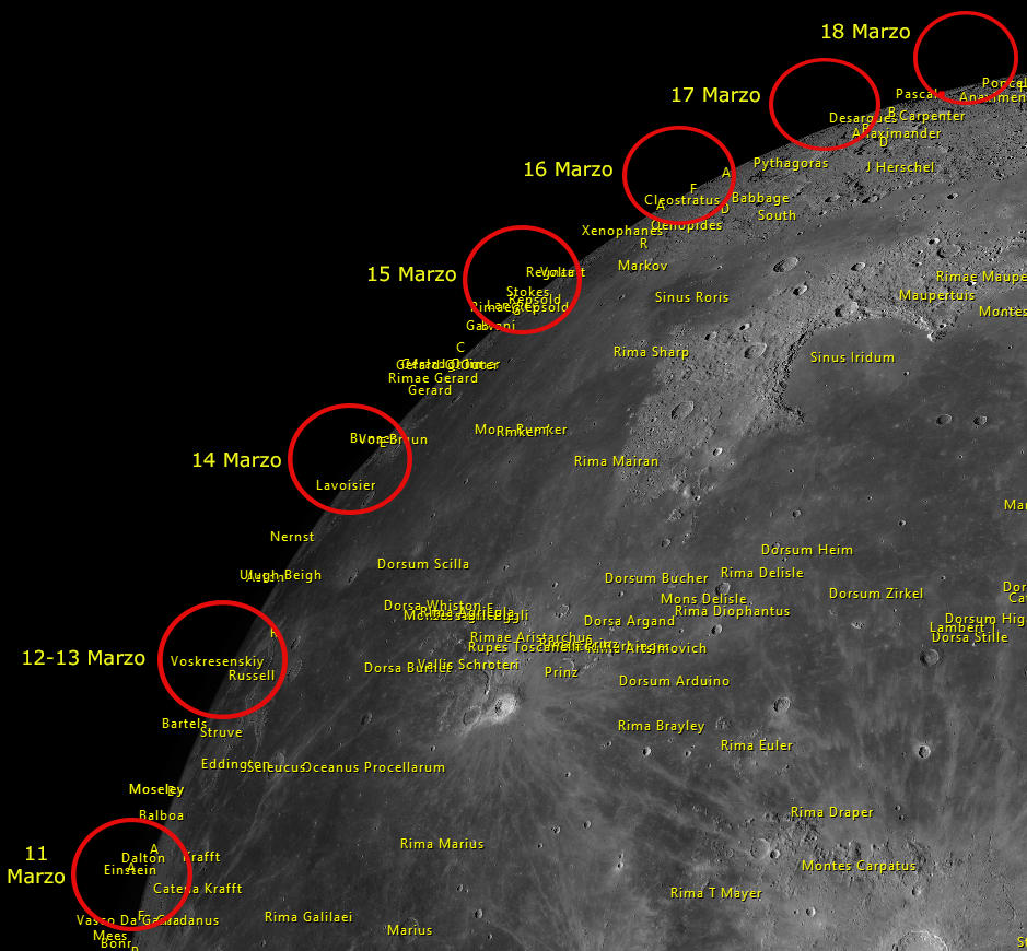 - 10 Marzo. Fase calante 18,55 giorni – Librazione crateri Grimaldi, Riccioli