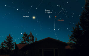 La più bella congiunzione del mese di gennaio è quella che avviene all’alba del 29 e 30 gennaio quando una falce di Luna calante transita sullo Scorpione tra Antares e Venere. Alle 6:45 del giorno 29, la Luna transita 11° a ovest di Venere (mag. –4,4) e 3,5° a est di Antares (alfa Scorpii; mag. +1,0), con i tre oggetti posti quasi alla stessa altezza di +19,5° sull’orizzonte.