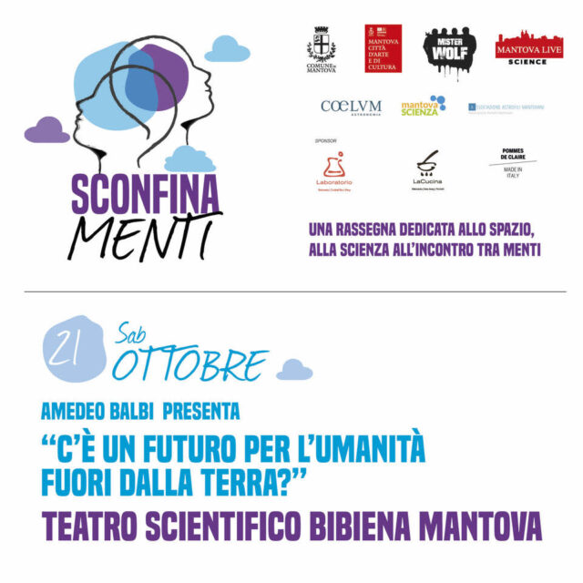 SconfinaMENTI, la cui partenza è avvenuta lo scorso 30 settembre e ha già ospitato l’astrofisico Matteo Miluzio, del progetto di divulgazione Chi Ha Paura del Buio, e Adrian Fartade, continua sabato 21 ottobre con Amedeo Balbi, che condurrà la conferenza spettacolo C’è un futuro per l’umanità fuori dalla Terra?