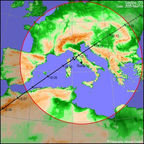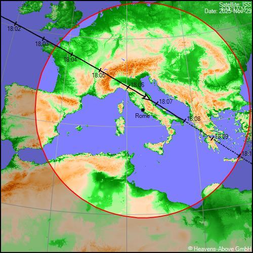 Infine, l’ultimo transito notevole del mese si avrà il 30 Novembre, dalle 17:12 alle 17:21, da NO a ESE. Ottima visibilità dal Nord-Est e dalle regioni Adriatiche, con magnitudine massima di -3.3.