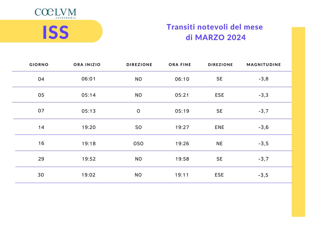 La ISS – Stazione Spaziale Internazionale sarà rintracciabile nei nostri cieli in orari mattutini. Avremo quattro transiti notevoli con magnitudini elevate durante il mese, auspicando come sempre in cieli sereni.