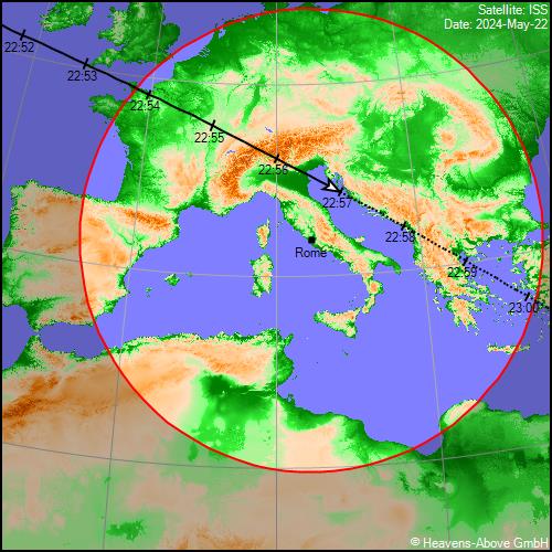 Alla sera del 25 Maggio, dalle 22:01 verso NO alle 22:08 verso ESE, un nuovo transito della Stazione Spaziale perfetto per tutta Italia, con una magnitudine massima a -3.7.
