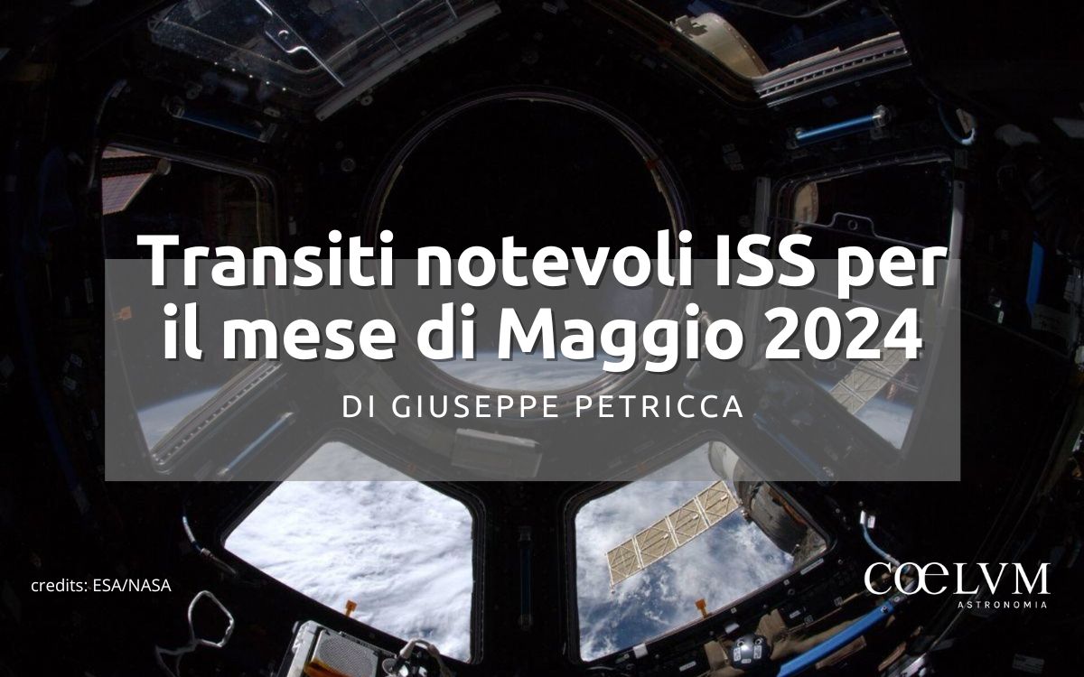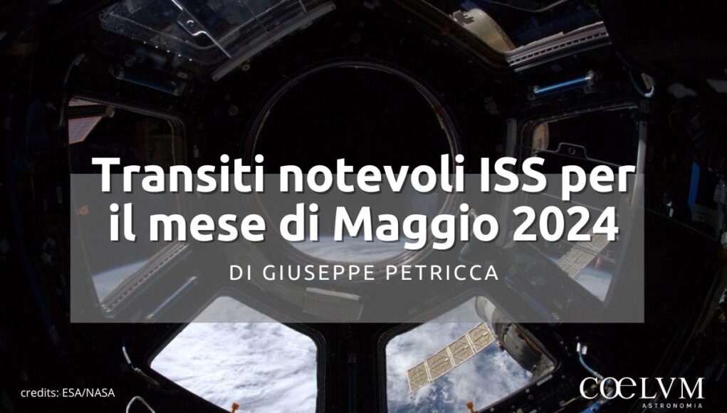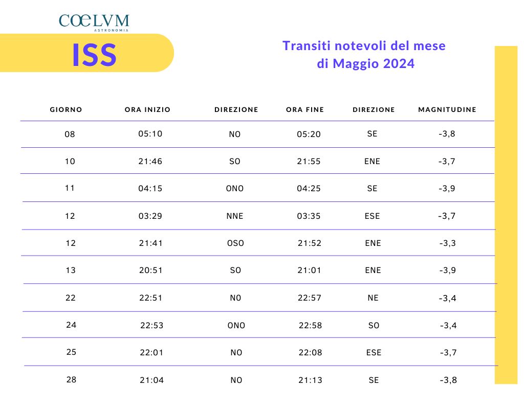 Il 12 Maggio, dalle 03:29 alle 03:35, da NNE ad ESE, avremo un transito parziale avvistabile da tutta Italia. Magnitudine massima a -3.7 non appena la Stazione Spaziale uscirà dall’ombra della Terra.