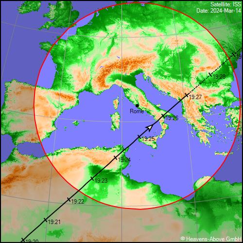 Arrivando a fine mese, avremo il miglior transito serale del mese il 29 Marzo, dalle 19:52alle 19:58, da NO a SE, osservabile al meglio da tutta la nazione, con magnitudine massima a -3.7.