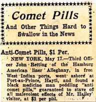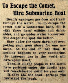 “Noleggiate un sottomarino, riempitelo con provviste e acqua per tre giorni, e domani [giorno del previsto attraversamento della coda] immergetevi. Maggiore la profondità, tanto meglio. Rimanete sott’acqua per tre giorni, senza osare metter fuori il naso. Alla fine di questi tre giorni, il cianogeno nell’atmosfera si sarà dissipato. A quel punto, se tutta la popolazione del pianeta sarà morta per gli effetti del gas velenoso, potete rivendicarlo come vostra proprietà. Se invece non sono tutti morti, forse riuscirete a sostenere le loro risate.”Ma i titoli con cui i grandi quotidiani salutarono i loro lettori nelle ultime edizioni prima del momento fatale erano tutt’altro che ironiche. Uno per tutti, la prima pagina del The Times recitava: