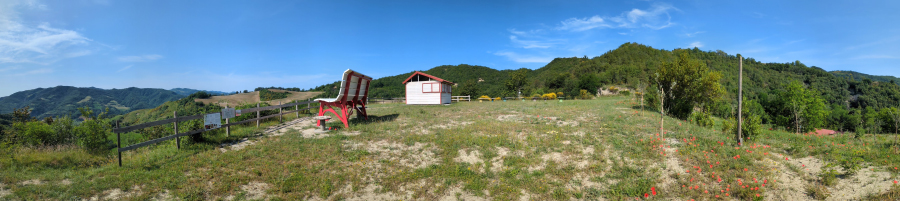 Veniamo al cielo: purtroppo un giudizio obiettivo al 100% non posso ancora darlo: veli e foschia hanno favorito l’inquinamento luminoso proveniente da Forlì, ad est della struttura (la prima notte, la seconda copertura al 100%). Ma da SSE a N, in senso orario, si può invece godere di un cielo molto buono, con scarsissimo inquinamento luminoso. La casetta presente, adesso vuota, era un vecchio osservatorio e la collocazione la dice lunga sulla possibile qualità del cielo, garantita appunto dalla presenza del Parco naturale adiacente (direzione O). Lo spazio sul pianoro è molto ampio, concedendo la possibilità di organizzare eventuali star party (ne ho parlato col gestore che è rimasto entusiasta all’idea). In conclusione, lo considero un posto assolutamente da provare per gli astrofili. E se è brutto tempo il cinghiale di nonna Otelia vi farà tornare il buon umore.