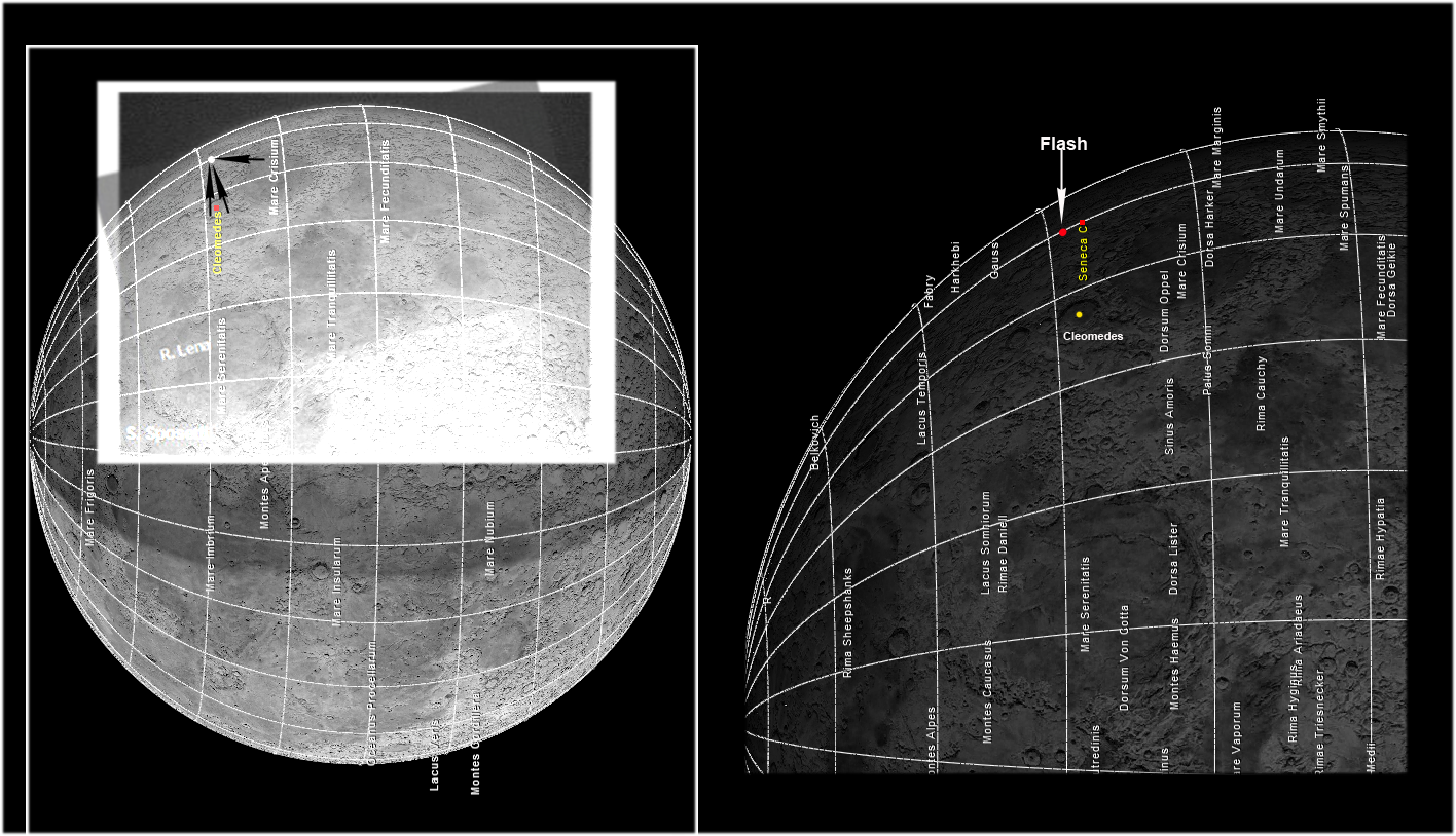 Sovrapponendo le tre immagini, il punto luminoso non manifesta alcuna parallasse evidente, nonostante la base assai lunga tra Roma ed il Canton Ticino. La simultaneità delle osservazioni e la presenza del flash nella stessa posizione sulla superficie lunare indica che, con alta probabilità, l’evento registrato sia dovuto ad un impatto di un piccolo meteoroide. Lo strumento con maggiore apertura mostra il flash per una durata di circa 80 millisecondi; negli altri strumenti (più piccoli) il flash appare più breve. L’intensità di picco del flash è pari a circa 8 mag V. La verifica della presenza di eventuali satelliti terrestri lungo la linea di vista è negativa per un diametro di 3 gradi. Le coordinate del flash vengono determinate a 73 ° ± 4 ° Est e 27 ° ± 3 ° Nord, nella regione vicino al cratere Seneca C, a nord est del Mare Crisium.