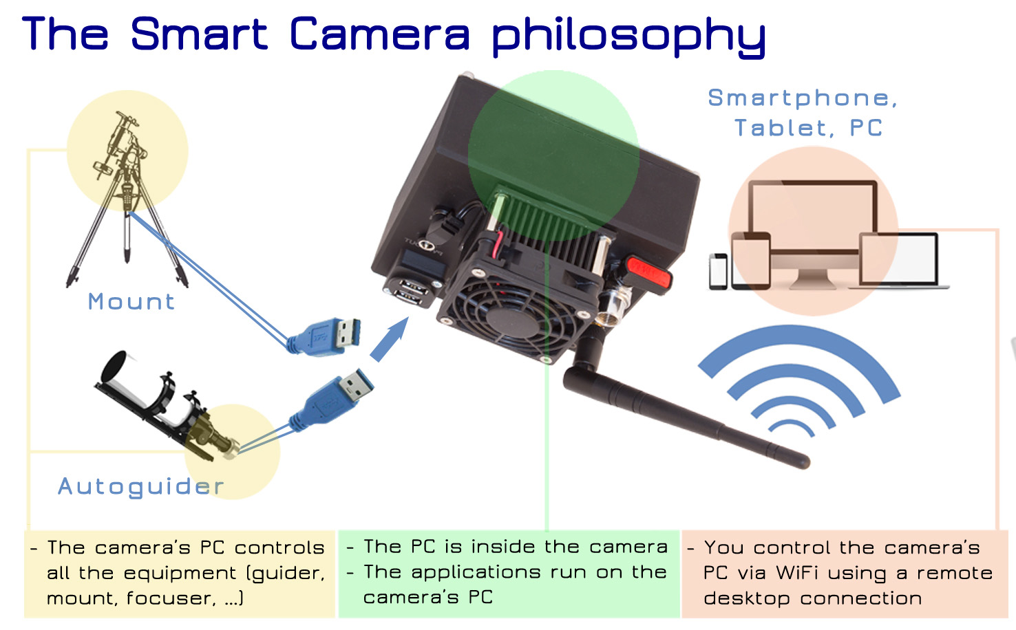 Come già detto, entrambe le camere usano l’approccio standalone delle camere Astrel ed incorporano al loro interno un PC in grado di gestire sia la camera che tutti gli accessori del setup astrofotografico, come autoguide e montature. Le camere, cioè, possono essere controllate nelle sessioni astrofotografiche senza necessità di un computer tramite connessione WiFi con uno smartphone, un tablet (o un PC). La AST16200B prevede anche la modalità wired via Ethernet e quella stand-alone con il display ad alta risoluzione da 5” e la mini tastiera wireless. Lo spazio di archiviazione base on-board della camera è di 8 Gb per la AST8300X e 16 Gb per la AST16200B, che possono crescere in entrambi i casi fino a 64Gb.
